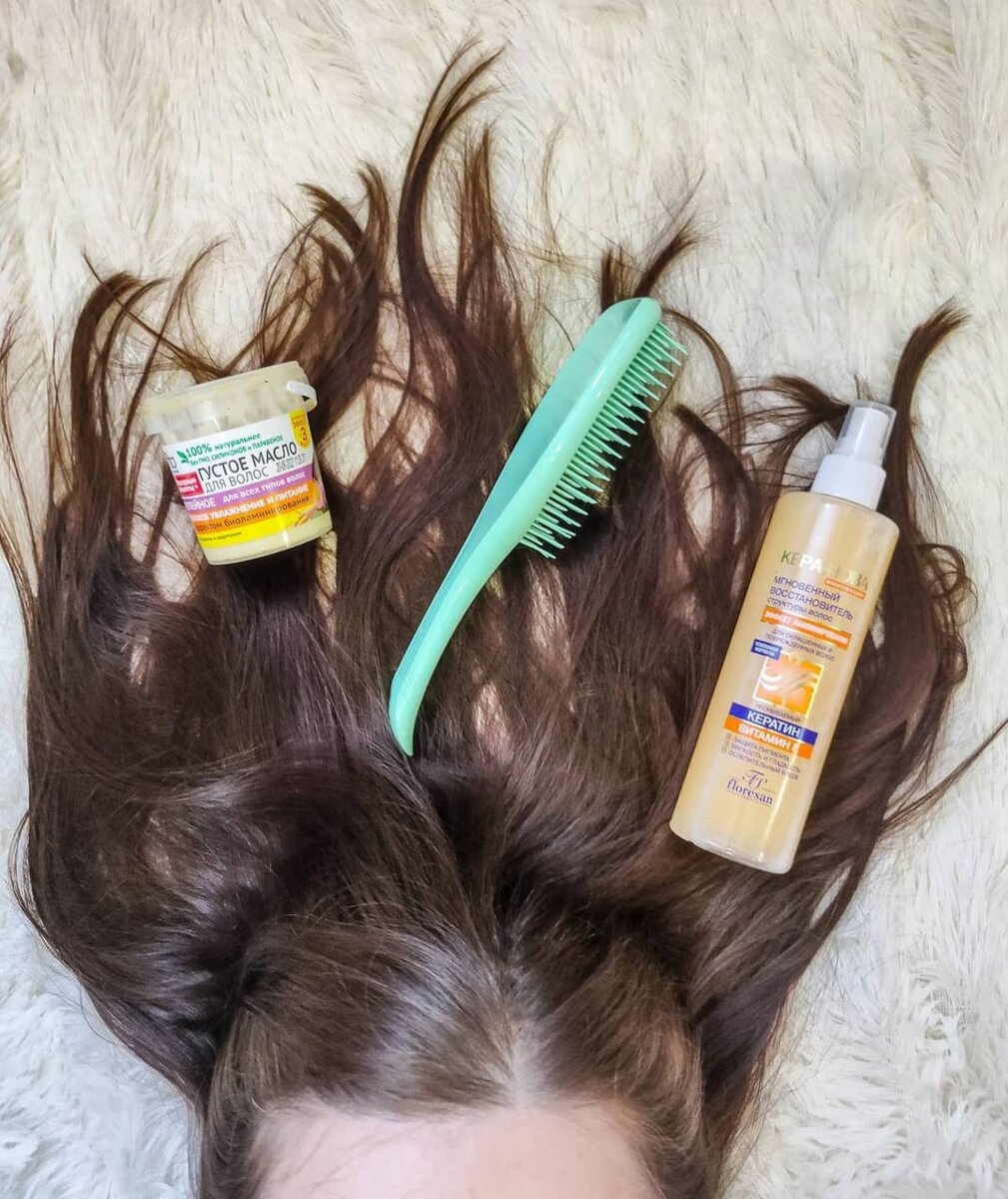 Всем привет! Волосы - моя больная тема. Ну не нахожу я, времени и желания на уход за ними! Но всеми силами стараюсь исправиться 😅 Так что периодически пробую что-то интересное. В этот раз попробовала два средства из Fix Price. ✨Репейное масло от Фитокосметик - мой фаворит ❤️ Долго оно пылилось у меня на полке, я все ленилась его начать. Но как начала, случилась любовь с первого применения! Само масло густое, но нежное и воздушное. Хорошо распределяется по волосам. Делает их мягкими, более гладкими. После использования волосы легче расчесываются. Что удивительно, масло совсем не жирнит волосы (даже корни). ✨Спрей для волос фаворитом не стал, но он неплох. Приятно пахнет. Можно наносит на влажные и сухие волосы. После использования волосы не пушатся, легче расчесываются. Эффекта ламинирования на моих волосах нет. Важный недостаток этого спрея - плохой пульверизатор. Он протекает. Пользовались такими средствами? Как вам? P.S. На фото задействована расчёска Tangle Teezer, о которой я мечт