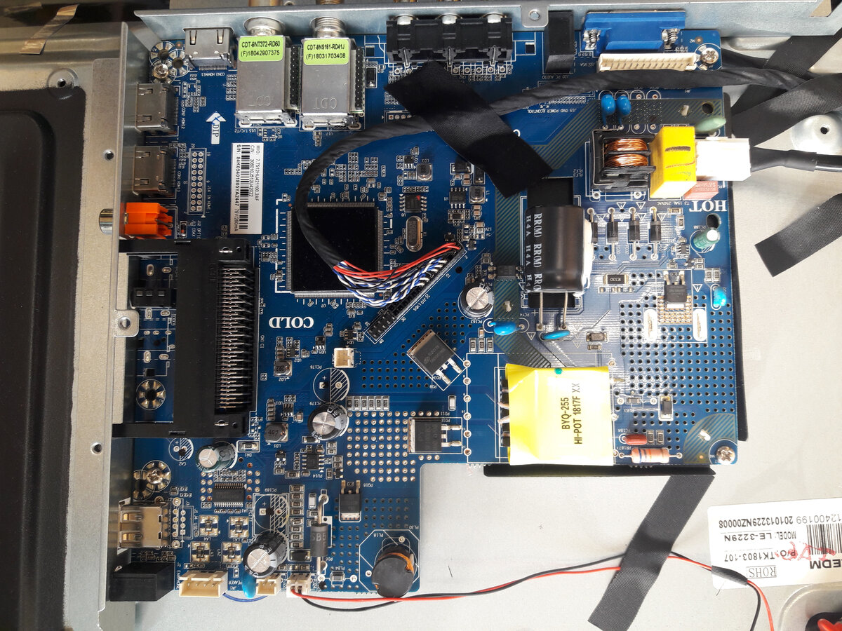 Всем здравствуйте! Рад новой встрече на канале! И всех с праздником! Сегодня у нас на ремонте телевизор BBK 32LEM 1027/TS2C. С неисправностью пропадает изображение , звук остаётся. В нашем случае был неисправен светодиод в одной из двух линеек. Похожее описание по ремонту подсветки , но с другими телевизорами можно посмотреть в ЭТОЙ или в ЭТОЙ статье. А сегодня расскажу как после замены светодиодов правильно ограничить ток в данной модели телевизора и майн платы. Фото майн телевизора ниже. В данной модели применена майн плата модель 7.t512hu421100.2af доработка будет описана ниже. В принципе такая майн может встречаться в телевизорах разных производителей. При более близком рассмотрении может показаться всё просто. СтоИт транзистор и в цепи стока стоят резисторы. Выкидываем один или два и всё хорошо, но здесь немного не так! На фото ниже я обвёл белым резисторы КОТОРЫЕ НЕ НУЖНО ТРОГАТЬ!!! А на следующем фото щупом показываю какой резистор нужно удалить после ремонта самой подсв