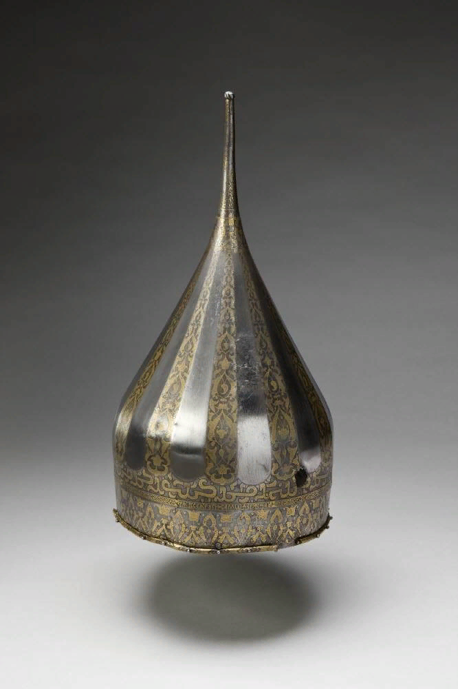 Сейчас, судари мои, приготовьтесь. Я не предлагаю вам ответ, я предлагаю лишь вопрос - а ответ на него я искренне хотел бы знать сам... Один из самых известных русских шлемов - это шлем Иоанна Васильевича Грозного, изготовленный ориентировочно между 1533 и 1547 годами. Вот он: С точки зрения типологии такое боевое наголовье в русском оружиеведении принято называть "шелом" - очень высокий, отчетливо цилиндроконической формы, с длинным шпилем на верхушке, при этом - с "мелкой" посадкой на голове, без наушей, бармицы, козырька и т.п. В эпоху Грозного шеломы уже потихонечку устаревали и сменялись шишаками - более глубокими шлемами, формы которых тяготели к полусфере, а не к конусу. Шлем выкован из стали и богато украшен латунью, серебром и золотом. Масса его небольшая - 1 кг 180 г, высота - 38 см, диаметр - 19 см. Способ изготовления - цельнокованый. Есть следы ремонта, например горизонтальная полоса на шпиле - признак того, что его однажды разрезали пополам, а потом соединили. На шлеме е