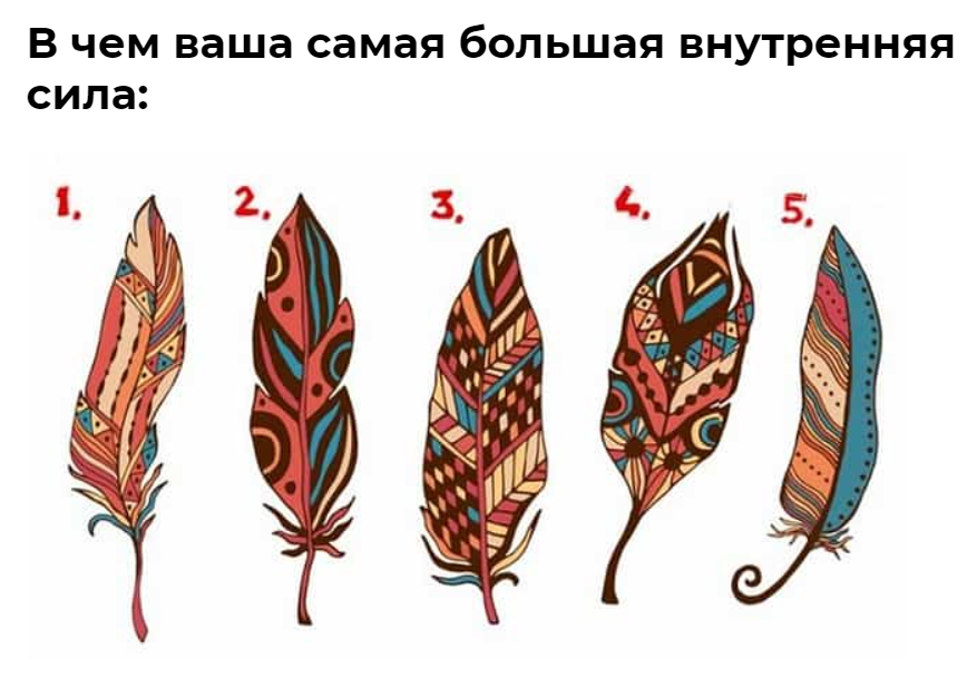 Приветствую вас уважаемые читатели и гости канала ✨Fitness Brain✨! Вы хотите знать, в чем ваша внутренняя сила? Что делает вас таким уникальным? Внутренняя сила человека-это качество характера, которое показывает, как человек отреагировал на боль, проблемы и трудности в его жизни. По ней можно понять, как вы переживете сильное волнение. Она дает людям представление о том, как вы переживете сильное волнение или насколько полезны вы в кризисной ситуации. Это также кое-что говорит им о том, какой вы лидер и как вы отреагируете и на похвалу, и на критику. Развитие силы в себе помогает легче пережить трудные времена и исправить свои ошибки. Она действует как щит, когда мир испытывает вас на прочность. Предлагаю пройти тест, который вам все расскажет. Вам просто нужно внимательно посмотреть на изображение и выбрать перо, которое больше всего вас притягивает к себе. Советую долго не вглядываться и выбрать понравившееся вам перо. Расшифровку теста вы можете прочесть ниже. Ну что проверим, в