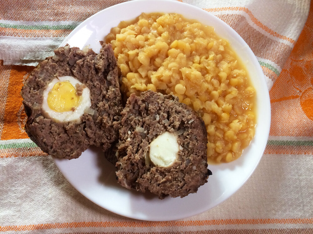 Это блюдо, которое я лично полюбил в детском саду. Из невеликого ассортимента садовской столовой именно этот пункт меня неизменно радовал и заставлял съедать всё без остатка. Не знаю уж, что именно меня здесь привлекло, теперь и не упомнить. Но точно помню, что всегда ждал, когда же в меню будет рулет с яйцом. Именно о нём пойдет речь сегодня. Я думаю, многие вспомнят об этом чуде – котлете, внутри которой находилось целое куриное яйцо. Сегодня я взрослый, и мне хочется повторить, в меру сил, этот вкус, чтобы хоть в ощущениях вернуться в чудесные времена моего детства, когда деревья были выше, а люди – добрее. А правильным гарниром к этому блюду станет гороховое пюре – советское блюдо, которое вы уже не встретите нигде и никогда. Тоже в детском саду практиковалось регулярно. В общем, наука тут несложная. Справится любой. Для начала нам понадобится мясной фарш – такой, какой вы любите. По классике используется смесь говядины и свинины, но тут каждый ориентируется на свой вкус. Фарш нуж
