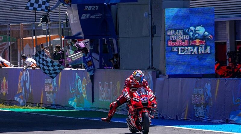 Джек Миллер одержал первую победу в Moto GP за пять лет, продемонстрировав отличное выступление на Гран-при Испании в Хересе, опередив своего партнера по команде Франческо Багнайю, вместе с которым они принесли первый дубль для «Ducati» с 2018 года. Миллер совершил характерный молниеносный рывок, выйдя вперед с третьего места на стартовой решетке — австралиец опередил Франко Морбиделли. Однако его время во главе пелотона оставалось коротким, так как Фабио Квартараро быстро пробился сквозь лидеров после того, как опустился на четвертое место после старта с поула, вернув лидерство всего после четырех кругов. Заводской гонщик «Yamaha» провел на вершине следующую дюжину кругов, контролируя свое преимущество впереди, хотя Миллер оставался на 1,2 секунды позади француза, когда пара оторвалась от Морбиделли, занявшего третье место на байке «Petronas Yamaha SRT». То, что выглядело легкой пробежкой Квартараро к третьей победе подряд в Moto GP, вскоре сошло на нет, хотя, когда он начал бороться