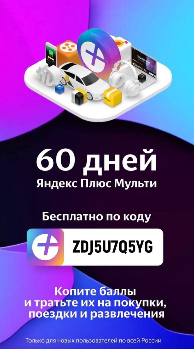 Бесплатно получаем 60 дней доступа на Яндекс.Плюс Мульти: 🎶 Яндекс.Музыка, более 60 млн треков 🍔 Яндекс.Маркет кешбэк баллами до 5% за покупки ⏳ 300 баллов за пополнение счета в течение 2 недель 🚕 до 10% кешбэка на все поездки в Яндекс.GO -и другие бонусы для пользователей Заходим в раздел активации кодов И активируем код: ZDJ5U7Q5YG Доступом Плюс Мульти можно делиться с родными и друзьями (до 4 аккаунтов и до 10 устройств)