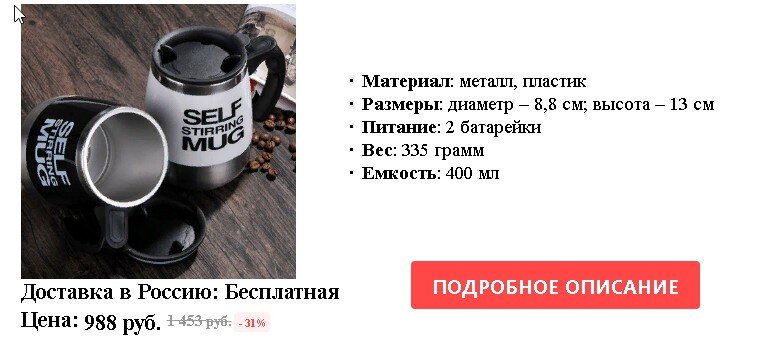 Кружка из нержавеющего металла с герметичной крышкой и встроенной автоматической мешалкой. Нажатием кнопки содержимое начинает размешиваться. Источник питания – 2 батарейки. Емкость – 450 мл. (Подробнее: https://ali.ski/tcHK1) Плюсы: Быстро размешивает Тихая (Подробнее:https://ali.ski/tcHK1 )