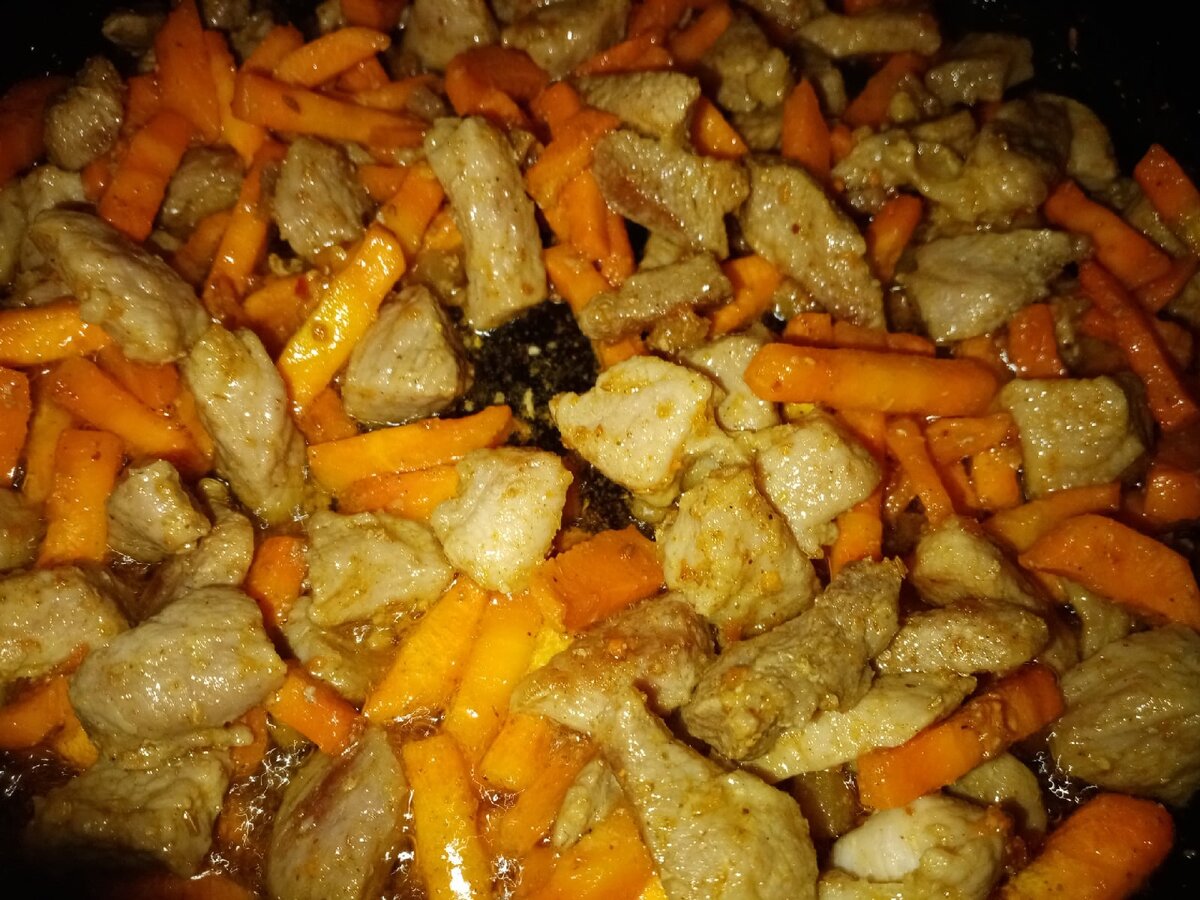 Плов плову рознь, и у каждого какой-то свой рецепт, прям как с борщом. Мой муж очень его любит, и я многие годы пыталась добиться "того самого вкуса", которого он хотел. А хотел он как готовят в шашлычках. То получалась каша с мясом, то приправы в приправах... И наконец-то я нашла лучший для нашей семьи рецепт. Делюсь. Первым делом разогреваю сковороду с небольшим количеством растительного масла, отправляю туда мелко нарезанное сало и топлю его на медленном огне. Затем шкварки убираю в отдельную емкость и начинаю обжаривать мясо, нарезанное средним кубиком (если готовите с луком, то сначала пассеруете его). Как только мясо приобретет золотистую корочку - отправляю крупно нарезанную соломкой морковь и и обжариваю еще пару минут. В это время подготавливаю специи: сушеный лук, чеснок, перец красный, зира, паприка, лавровый лист молотый, немного сахара, соль. Пропорции на ваш вкус, я всегда кладу зиры чуть больше остальных специй. Отправляем все приправы в сковороду, хорошо перемешиваем