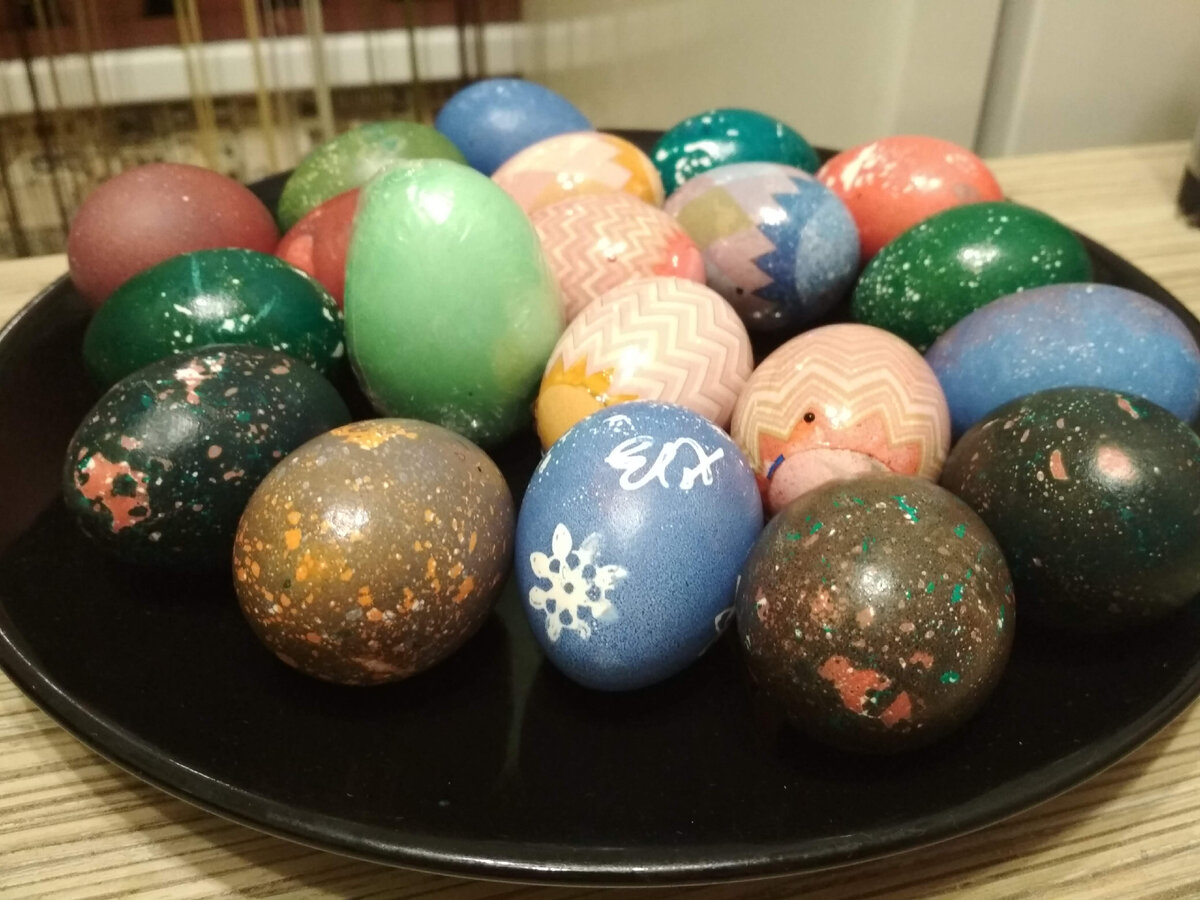 Чистый четверг все были обязаны искупаться. Топился титан для нагрева воды. Титан стоял в ванной комнате и топился дровами. Такая своеобразная баня. В пятницу мы пекли куличи и красили яйца. Яйца красили луковой шелухой, заранее привязав к яйцу марлей листики петрушки. Они получались интересные, как расписные. Яиц красили не менее 20 штук, так как ими будут обмениваться и оставлять на могиле.