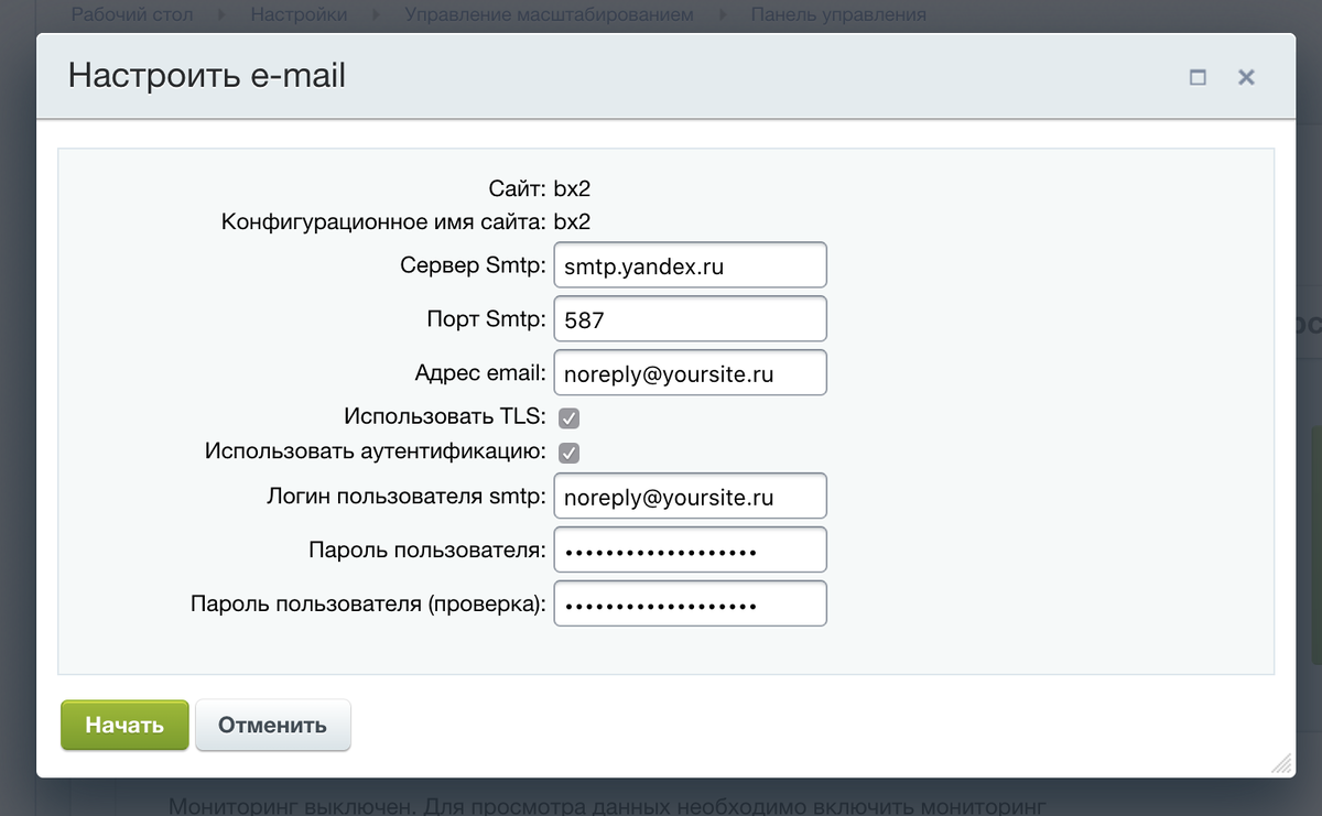 Далее введите адрес вашего SMTP-сервера, порт, e-mail (noreply@yoursite.ru), логин (noreply@yoursite.ru), пароль.
