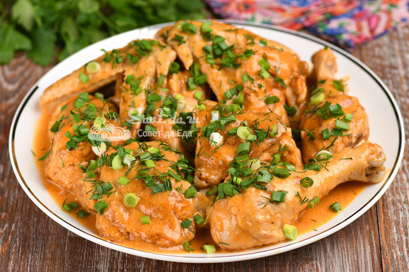 7. Выкладываем в соус обжаренные куриные кусочки, накрываем и тушим на средней температуре 30 минут.