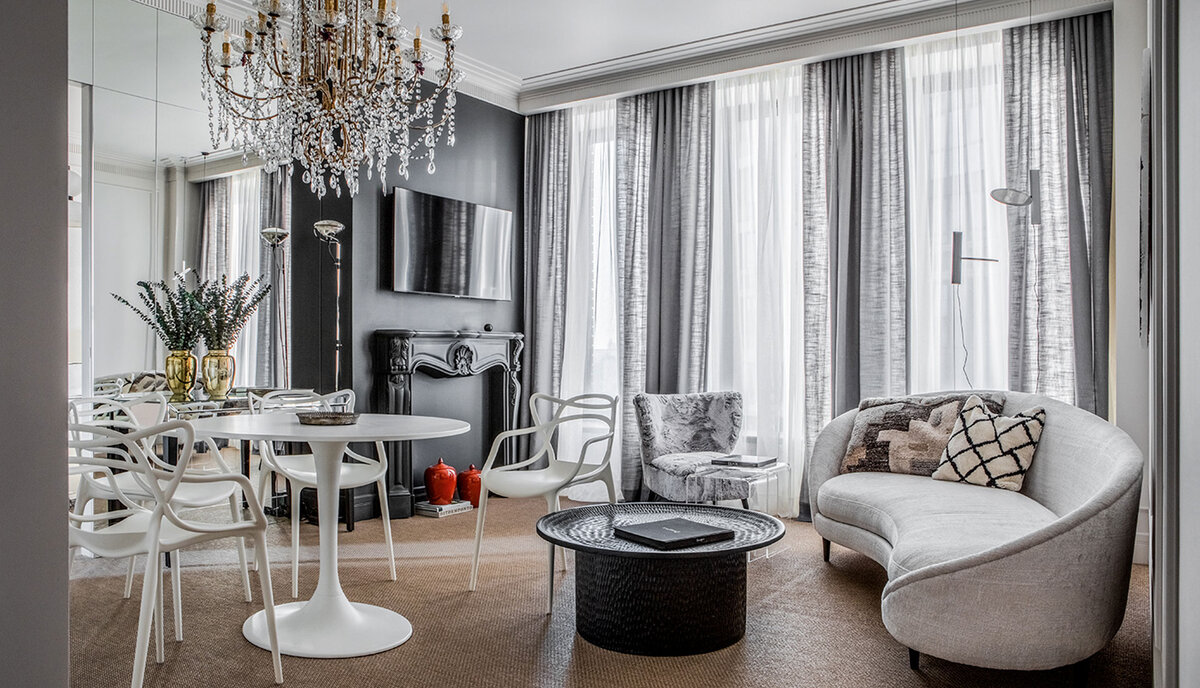 Поскольку вид из окон оставлял желать лучшего — они выходят на соседнюю башню, то было принято решение смесить акцент внутрь комнат, максимально насытив интерьер. «Мы хотели сделать универсальное пространство с атмосферой парижских апартаментов, с тремя их составляющими: камин, лепнина, люстры. Как всегда, сочетали противоположное: хрустальные каскады с пластиковыми стульями, лепнину — с лаконичной современной мебелью. Нам не нужно было ничего ни с кем согласовывать: разрабатывая проект, мы опирались только на собственную фантазию, здравый смысл и бюджет», — объясняют проектировщики