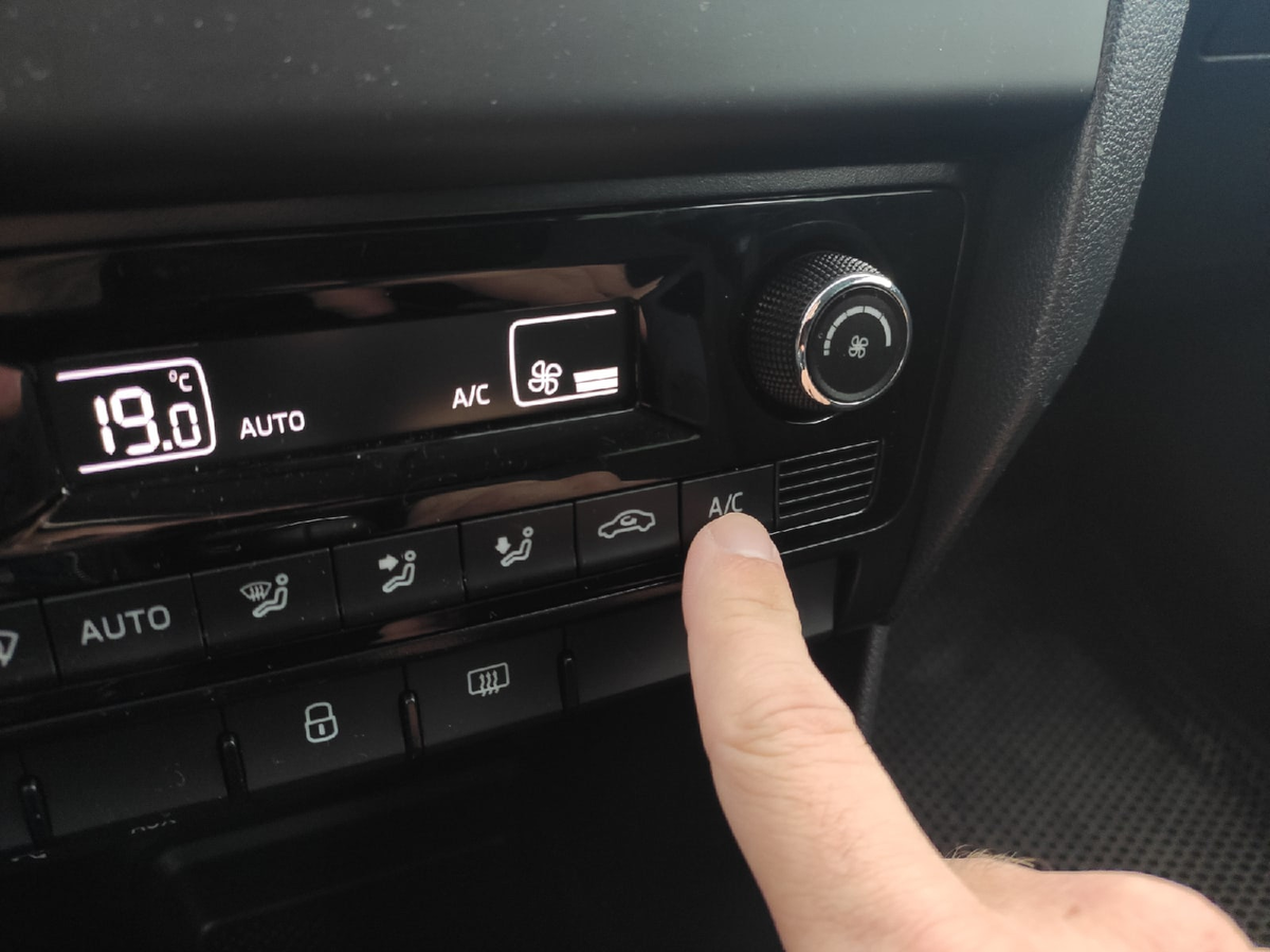 Начинаем с того, что запускаем мотор. Для автомобилей с обычным кондиционером: запускаем компрессор кондиционера кнопкой A/C, регулятор температуры переводим в самое холодное положение, направление воздуха вперед, скорость вращения вентилятора на середину. Для автомобилей с климат-контролем все примерно также, только температуру выставляем в LO и если был включен Auto режим, то выключаем, выставляя скорость на середину, а направление потока вперед.