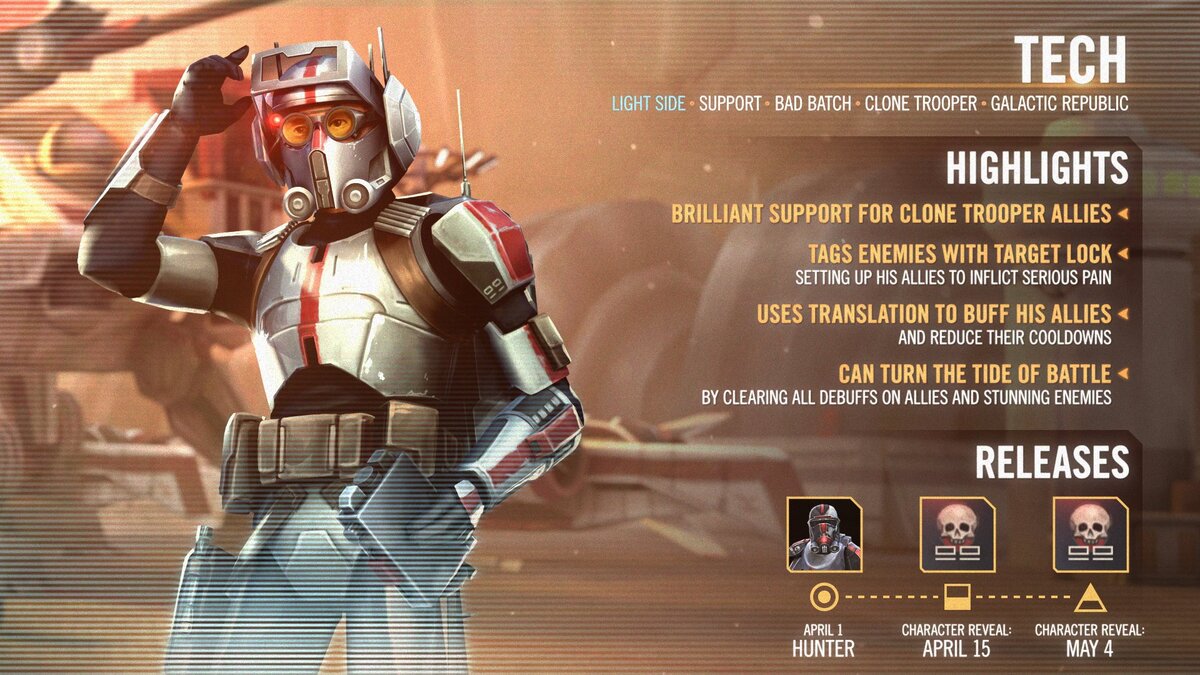 Переводчик клонов (уникальная): В начале боя Тех получает +1 к скорости за каждого союзного клона-штурмовика (вдвое больше за союзников из Бракованной партии). Если все союзники — клоны-штурмовики, Тех получает скрытность на 1 ход, а также +25% к эффективности за каждый действующий на него заряд перевода.