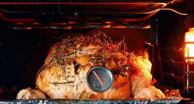 Запекая крупные куски мяса и тушки птиц, нелишне иметь в арсенале мясной термометр: по внешнему виду невозможно догадаться о степени готовности мяса, нужно знать внутреннюю температуру.