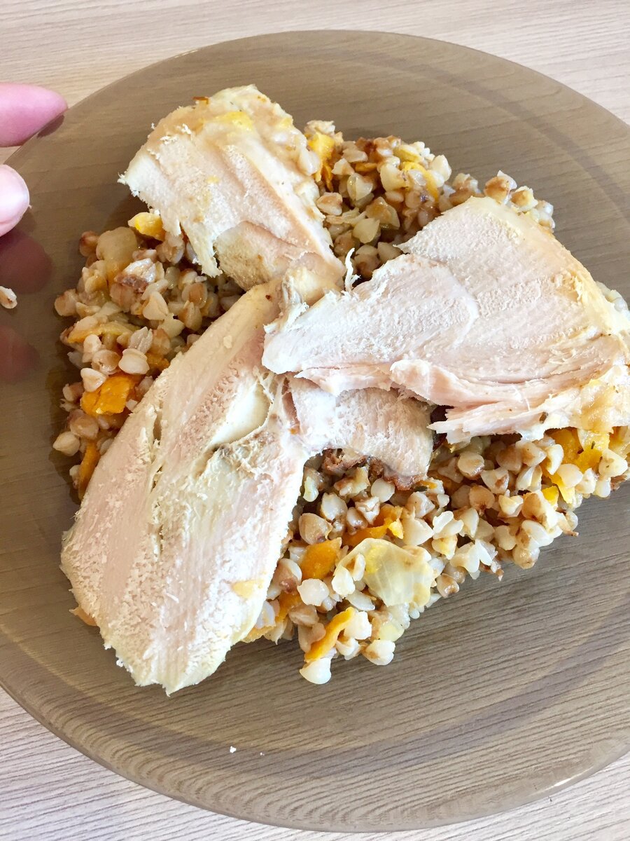 Все мы любим быстрые и простые рецепты. Они приходят на выручку нам так же, когда на готовку нет времени. Итак, высыпаем в форму 1,5 стакана гречки. Солим по вкусу. Выкладываем сверху обжаренный лук и морковь. Заливаем 3 стаканами воды. Сверху выкладываем замаринованную курицу. Для маринада я использовала 2 ст.л. мёда, 1 ст.л.горчицы, 2 ст.л.сметаны, соль, травы. На курице нужно сделать глубокие разрезы в виде сетки, иначе не пропечется. Это лучше сделать до маринования, но я забыла. Форму накрываем фольгой. Выпекаем 35 минут в разогретой духовке. Приятного аппетита! Если вам понравился рецепт, оставьте любой смайл в комментариях 🤗