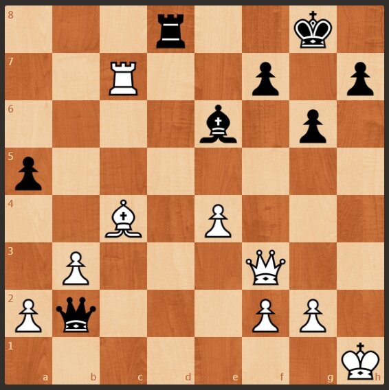 Предлагаю Вашем вниманию окончание партии Тисдалл - Сакс, 1077 год. В материальном плане позиция равная, но черным далось попасть ферзем на b2. А так же белый король неудачно попал на h1.