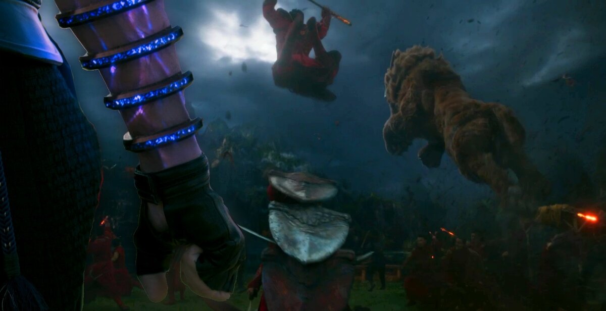 И это на самом деле те самые кольца, в чем можно убедтьбся из флэшбэк сцен с молодым Шан-Чи и его отцом, на руках которого все те же браслеты-кольца с голубым свечением. Их количество (а именно десять) не составит труда сосчитать в другой замечательной сцене - сражения Венву (он же Мандарин) с совершенно новым персонажем не из комиксов. Речь про Цзянь Ли в исполнении актрисы Фала Чэнь. Сцена не только является отсылкой к фильму «Дом летающих кинжалов», но и дарит надежду на еще один твист - кем же окажется новая героиня.