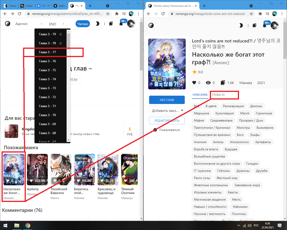 Всем привет, в этой статье я проведу сравнение двух сайтов. У каждого из них есть как весовые минусы, так и плюсы. итак, эти сайты - Мангалиб и Реманга 1. рекомендации (довольно незначительный) на Реманге часто можно заметить в похожих мангу, в которой почти нет глав Мангалиб - 1 Реманга - 0 2. количество глав почти во всех тайтлах на Реманге значительно больше глав Мангалиб - 1 Реманга - 1 3. качество сканов качество картинок, из который состоят главы значительно лучше на Мангалибе Мангалиб - 2 Реманга - 1 0. итог На самом деле пункт 1, вообще не важен. Хотя вы можете совмещать эти два сайта для своего удобства ) Спасибо за прочтение, ставьте лайки и подписывайтесь ) Другие мои статьи: моя девушка - зомби | манга манга - этот герой малость того как смотреть аниме с субтитрами в 1080p