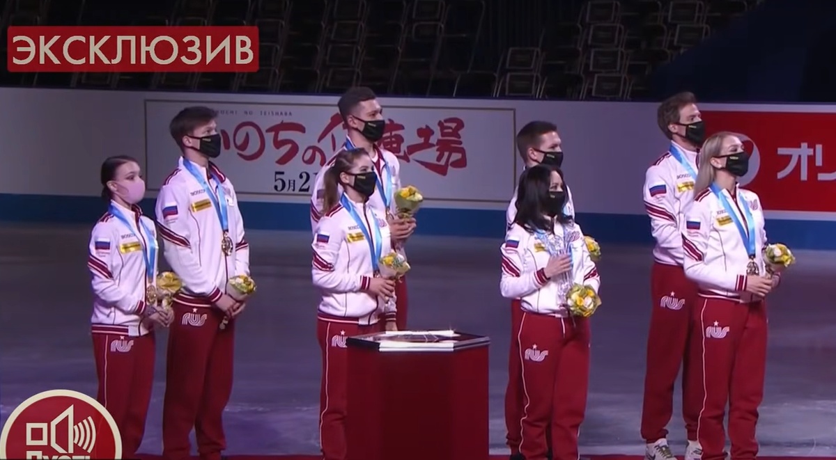 По традиции после громких побед наших фигуристов приглашают на шоу "Первого канала" - "Пусть говорят". На этот раз темой обсуждения стали громкие победы на Чемпионате мира и, конечно, World Team Trophy.