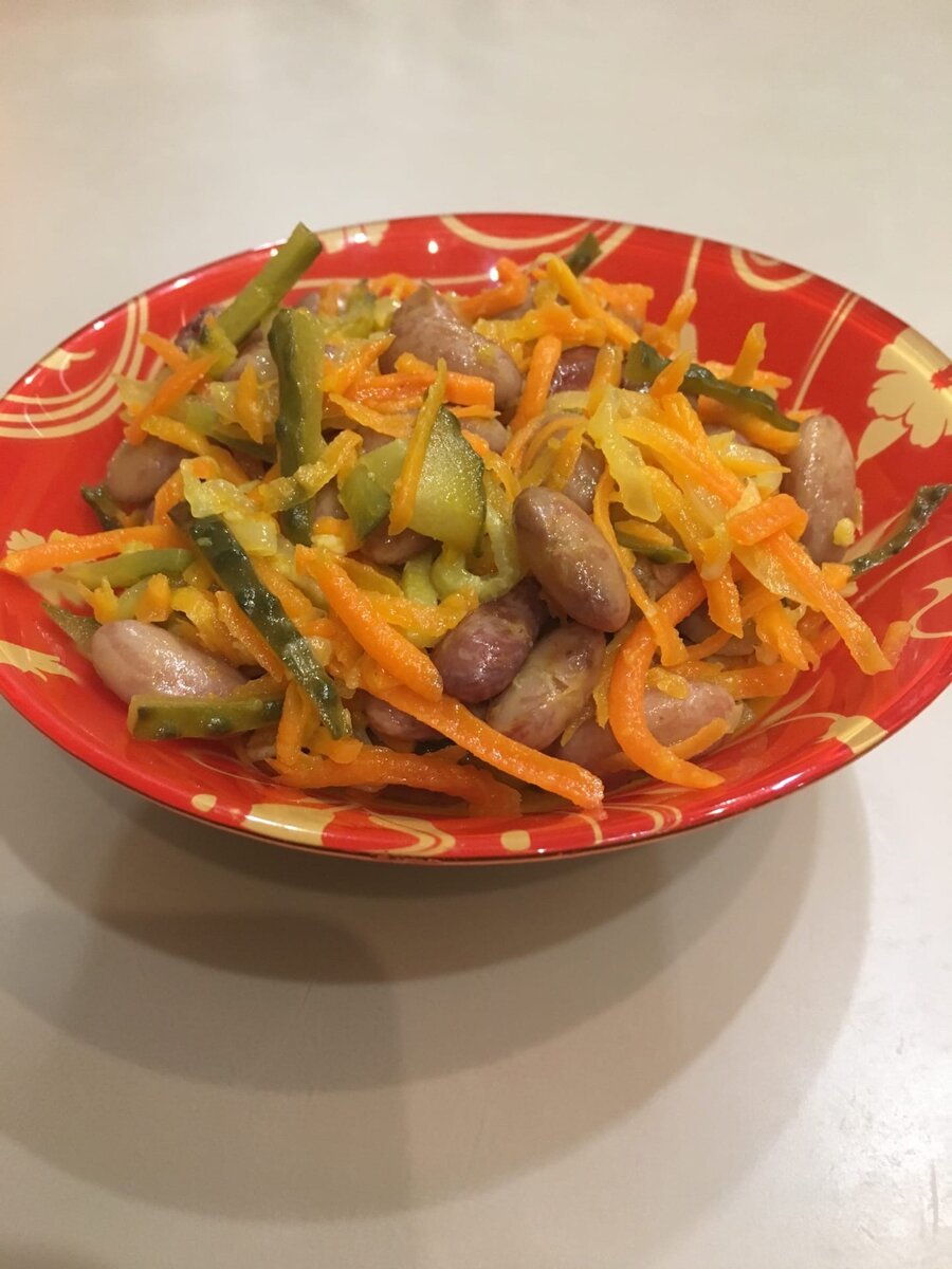 Ингредиенты:1. Фасоль готовая (вареная)2. Морковь3. Лук репчатый4. Огурец соленый