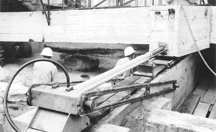 На начальном этапе приступили к созданию подкопа под фундаментом и выпиливания специальных прорезей в полтора метра в стенах цоколя. После этого было установлено 950 прочных стальных опор, на которые постепенно был перенесен вес здания. При этом, как заверяют представители компании, никаких трещин по зданию или проседаний не произошло во время выполнения работы. После этого были отстроены девять трелевочных волоков из бетона, в которые были встроены нержавеющие пластины 30 сантиметров в ширину, протяженность которых была подобрана точно до нового места установки здания.