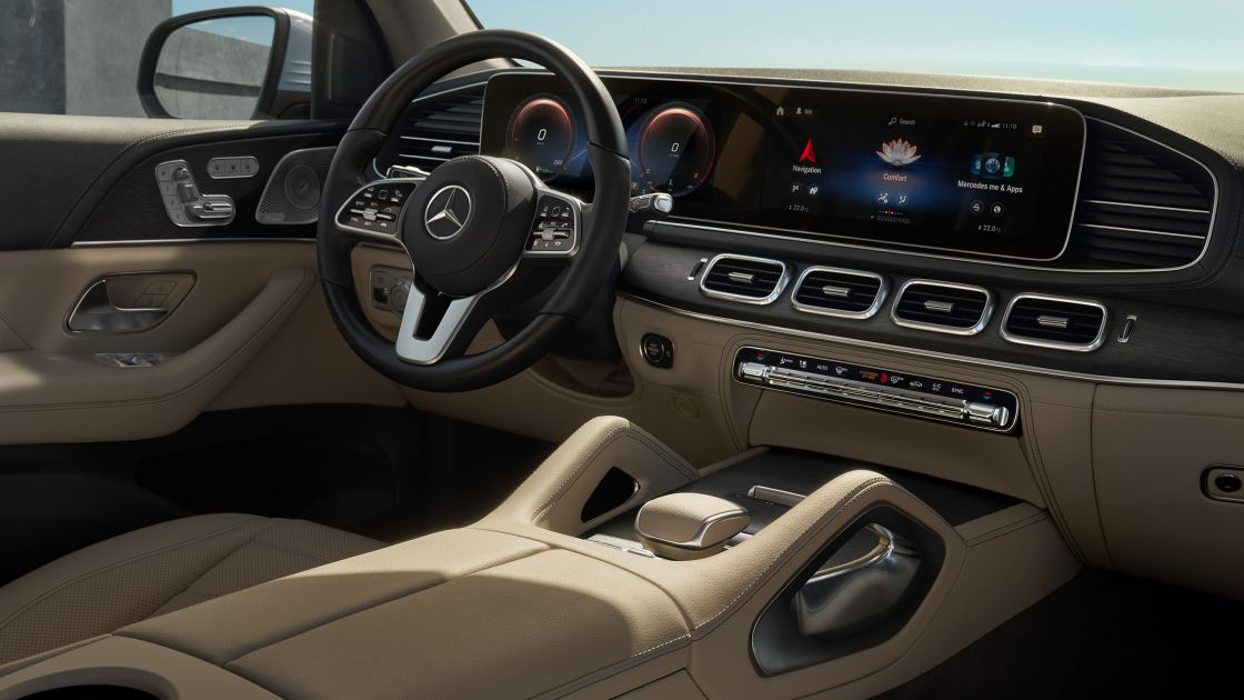 Классические элементы дизайна внедорожника создают волнующий контраст с полностью цифровым широкоэкранным дисплеем и указывают на решительный характер нового GLS. К ним относятся большие декоративные элементы из крупнопористого дерева, выразительные прямоугольные вентиляционные дефлекторы и такие доминантные детали, как поручни на центральной консоли.