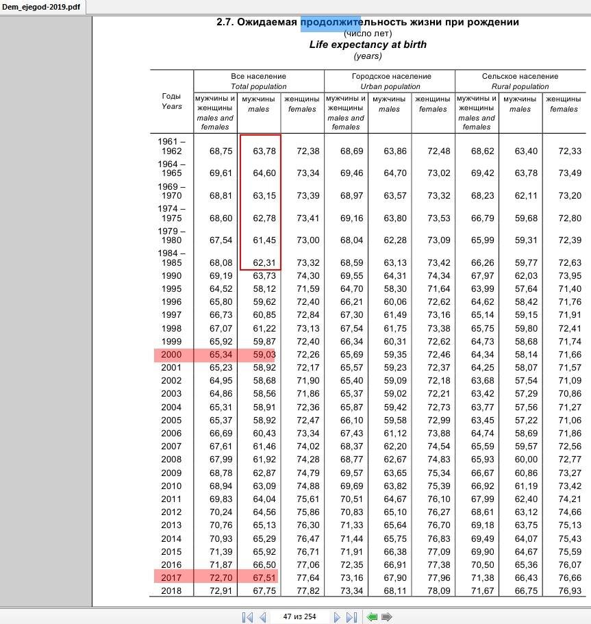 Вы спросите, а в чём же тут ложь? Да в каждой цифре! Дело в том, что нет в российской статистике такого показателя - "продолжительность жизни". Есть "О͇ж͇и͇д͇а͇е͇м͇а͇я͇ ͇п͇р͇о͇д͇о͇л͇ж͇и͇т͇е͇л͇ь͇н͇о͇с͇т͇ь͇ ͇ж͇и͇з͇н͇и͇ ͇п͇р͇и͇ ͇р͇о͇ж͇д͇е͇н͇и͇и͇", и если спичрайтеры думают, что это одно и то же, то они реально "альтернативно одарённые". Пропущенные ими слова всё меняют: здесь слово "ожидаемая" означает, что это не достигнутый уровень, а всего лишь прогноз какой-то группы экспертов (и прогноз этот можно будет проверить только лет через семьдесят), а слова "при рождении" означают, что даже этот прогноз относится не к нам, ныне живущим взрослым людям, а к младенцам, родившимся в данном году. То есть, цитату от путиноидных дебилов наподобие вот этой: "Президент напомнил, что в 2000 году продолжительность жизни составляла немногим более 65 лет. В 2017 году продолжительность жизни россиян достигла исторического максимума и составила почти 73 года" правильно читать следует так: "младенец, родившийся в 2000 году, должен, по прогнозу каких-то экспертов, прожить 65,34 года (причём, младенец мужского пола - всего 59 лет, то есть, даже до пенсии не доживёт). А младенец, родившийся в 2017-м году, должен, по прогнозу тех же экспертов, прожить 72,7 года". Табличка из "Демографического ежегодника-2019", скачанного с сайта Росстата: