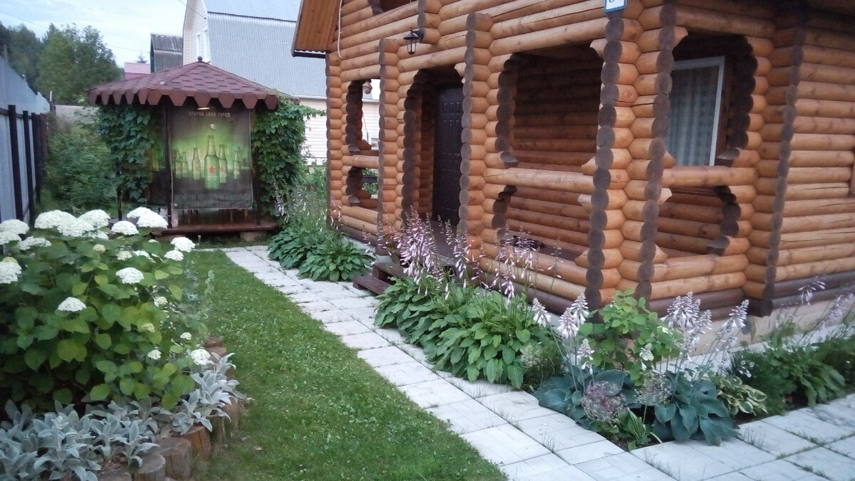 Вдоль дома мы сделали отмостку также с помощью плитки. А между отмосткой и дорожкой получилась очень удобная клумба, которую я засадила цветами, в основном хостами, маргаритками, шнитт-луком - об этом я писала отдельную статью - ссылочку дам в конце этого рассказа.