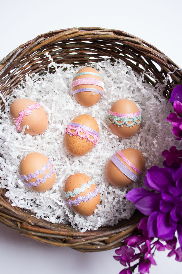 Выберите одну или несколько разных тесемок. Возьмите вареное яйцо и оберните тесемку или ленточку вокруг его центра. Если лента самоклеящаяся, то просто обрежьте кончик и приклейте ее к яйцу. Если же нет, то используйте крошечное количество термоклея, чтобы закрепить ленточку на яйце.