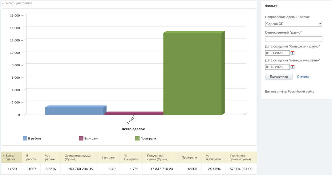 В этот раз будем использовать сделки в качестве объекта отчета. Наша цель — оценить потерянные и потенциально возможные суммы продаж по всем сделкам, созданным за выбранный период, а также определить количество созданных, проигранных и закрытых сделок.