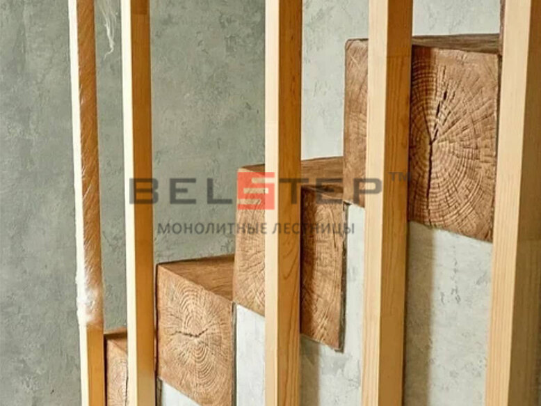 Монолитный каркас лестницы из бетона и арматуры заливаются в один прием, без швов. Выполняется по нормам строительства несущих конструктивных элементов (стен, перекрытий, колонн).