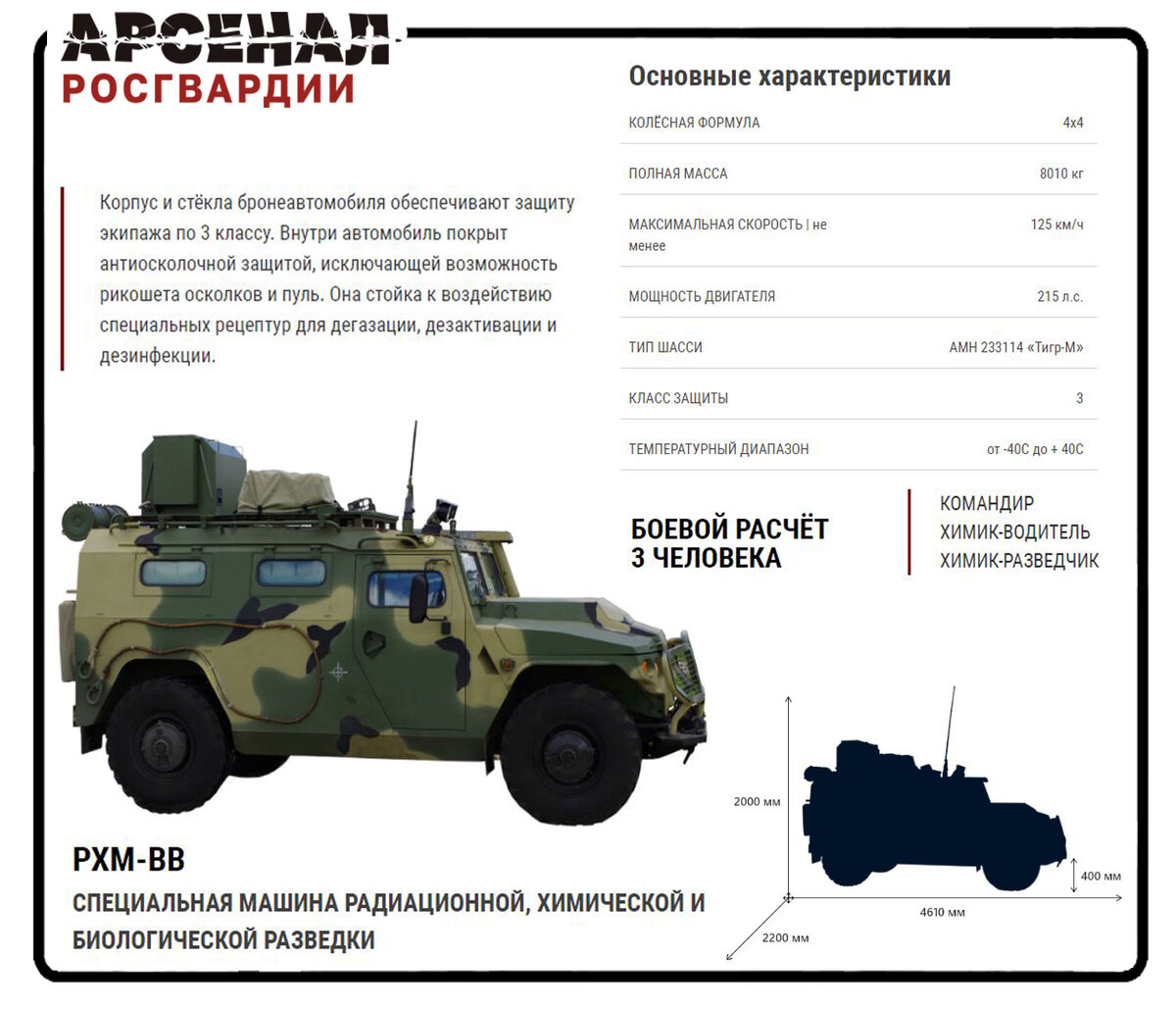 За основу при проектировании РХМВВ был взят полноприводный бронеавтомобиль «Тигр-М», который уже достаточно продолжительный срок используется во многих силовых структурах нашей страны, в том числе и в Росгвардии, что значительно упрощает эксплуатацию. На его шасси были установлены специальные приборы, дающие возможность вести радиационную, химическую и неспецифическую бактериологическую разведку. Комплекс бортового оборудования включает в себя детекторы α-, β-, γ-излучений и газоанализаторы с возможностью поиска боевых отравляющих веществ, токсинов и аэрозолей биологических средств. Помимо этого экипаж может отбирать пробы грунта, воздуха и воды с их последующей доставкой в лаборатории.
