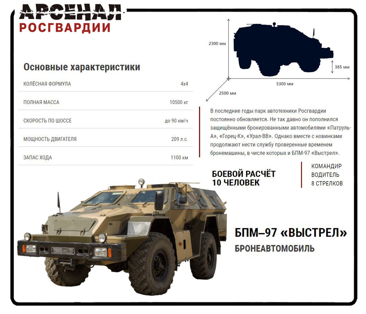 В последние годы парк автотехники Росгвардии постоянно обновляется. Не так давно он пополнился защищёнными бронированными автомобилями «Патруль-А», «Горец-К», «Урал-ВВ». Однако вместе с новинками продолжают нести службу проверенные временем бронемашины, в числе которых и БПМ-97 «Выстрел».