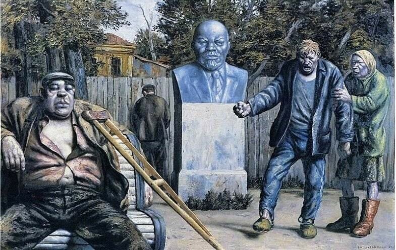 Картины художника отражают бессознательное восприятие парадоксов современной России, в которой индустриализация породила трудящихся, потерявших человеческий облик: распухшие от пьянки тупые лица, мощная людская плоть, грубые бесформенные