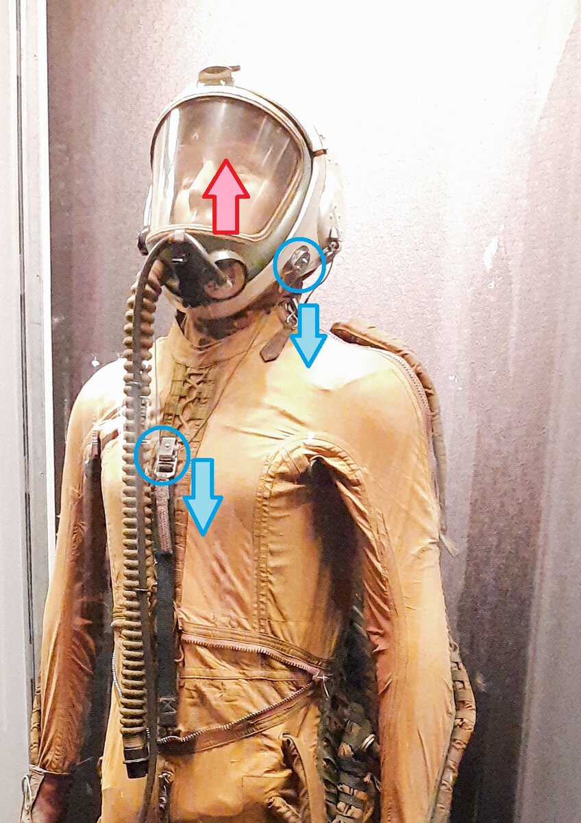 По этой причине, при индивидуальной подгонке скафандра «Орлан» по росту, допускается, что бы макушка головы упиралась в верхнюю часть шлема, т.к. при создании рабочего давления оператор немного «провалится» вниз и скафандр приобретет нужный размер.