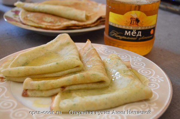 Неделю я вынашивала идею мятных блинов. Они получились интересные с привкусом мяты. Особенно это хорошо в летнюю жару. А заодно я опробовала новую блинную сковороду от Tefal.