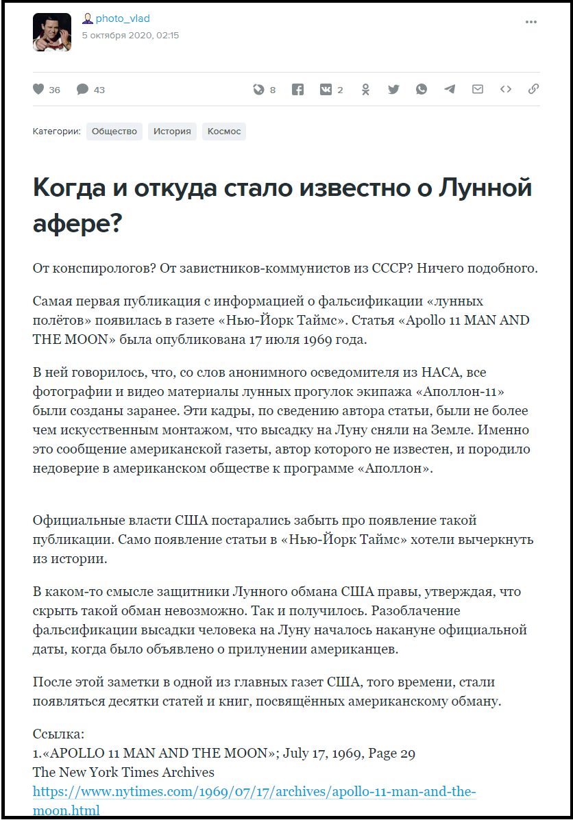 "Самая первая публикация с информацией о фальсификации «лунных полетов» появилась в газете «Нью-Йорк Таймс». Статья «Apollo 11 MAN AND THE MOON» была опубликована 17 июля 1969 года. "