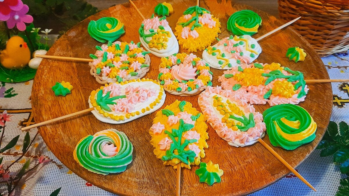 Шаг 6: Ну и теперь полет фантазии и творчества. Я делала пасхальные яйца и веночки на деревянной палочке, чтобы можно было фигурки воткнуть в любой кулич. Делаю основу из белковой массы, кладу палочку, сверху ее также прикрываю белковой массой и уже на эту основу наношу любой рисунок. Кстати, меренгу я наношу на коврик для выпечки. Конечно, если вас интересует этот процесс более детально, то лучше посмотрите видео, которое я прикрепила внизу.