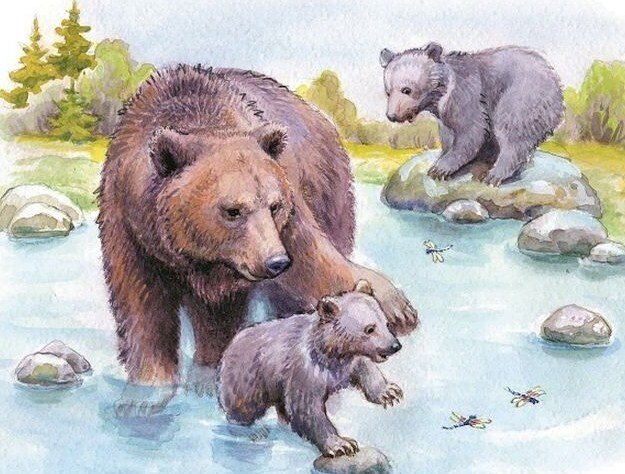 Сказка учит детей осмотрительности, осторожности вблизи крупных хищников, а также послушанию взрослых. Однажды трусливый охотник услышал пугающий шум и забрался повыше на дерево. Как оказалось, медведица с медвежатами вышли к озеру искупаться. Пока мама-медведица купала малыша, второй непоседа убежал…