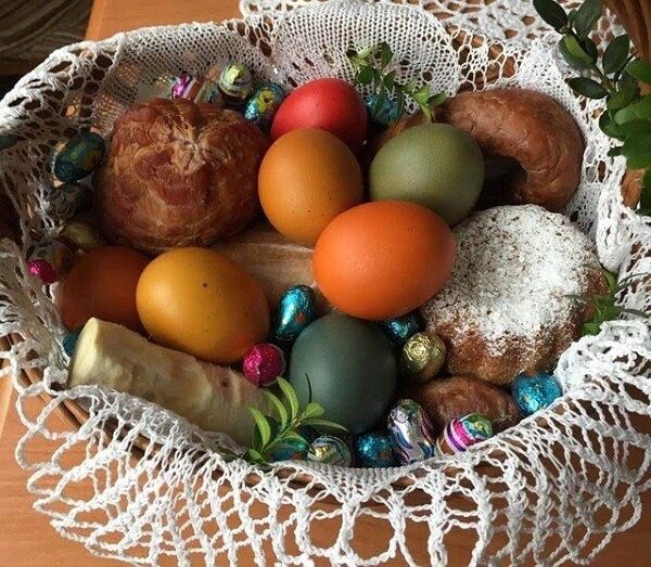 Набор продуктов, который должен быть в корзине на Пасху, традиционный: вареные яйца (или писанки, крашенки) творожная пасха, сдобный кулич, домашняя ветчина, колбаса или мясной рулет из свинины, сливочное масло, корешок хрена и обычная соль.