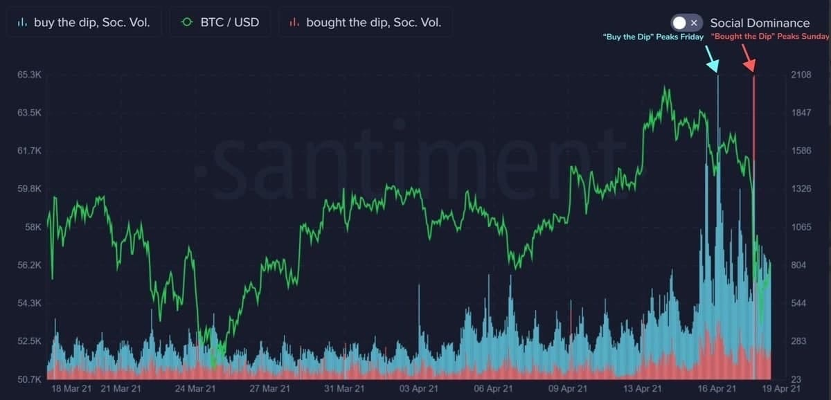Обвал Биткоина не помешает тренду — Santiment Тренд BTC остается бычьим вопреки возросшей волатильности. Аналитики Santiment оценивают частотность упоминания твитов с«buy the dip» (покупайте на низах) и «bought the dip» (закупился на низах). Согласно результатам исследования, своего пика число твитов с призывом закупиться на низах достигло 16 апреля, в то же время число постов про закупку на