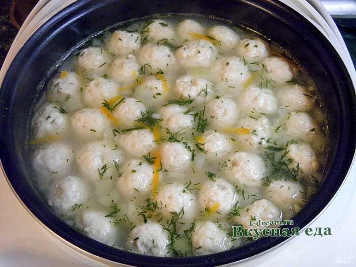 Зеленый суп с фрикадельками готов, кушайте со сметаной.
