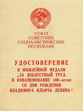 Вместе с Марией Александровной мы перебрали папку с наградными документами, в основном это были почетные грамоты предприятия за безупречный и добросовестный труд. В папке их было более сотни. Среди большой стопки грамот лежало маленькое удостоверение к юбилейной медали «За доблестный труд. В ознаменование 100-летия со дня рождения Владимира Ильича Ленина». В шкатулке нашлась и медаль к этому удостоверению. Мария Александровна вспомнила, как на предприятии в 1970 году, накануне субботника в торжественной обстановке вручали эти медали 20 передовикам производства. Юбилейная медаль отправилась в шкатулку ко всем памятным знакам, и о ее существовании было забыто.
