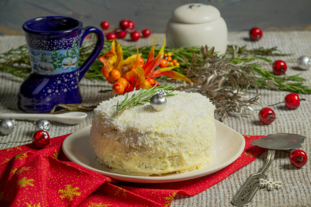 Новогодний торт «Снежный» готов! Ставим торт на нижнюю полку холодильника примерно на сутки. Перед подачей украшаем веточками розмарина.