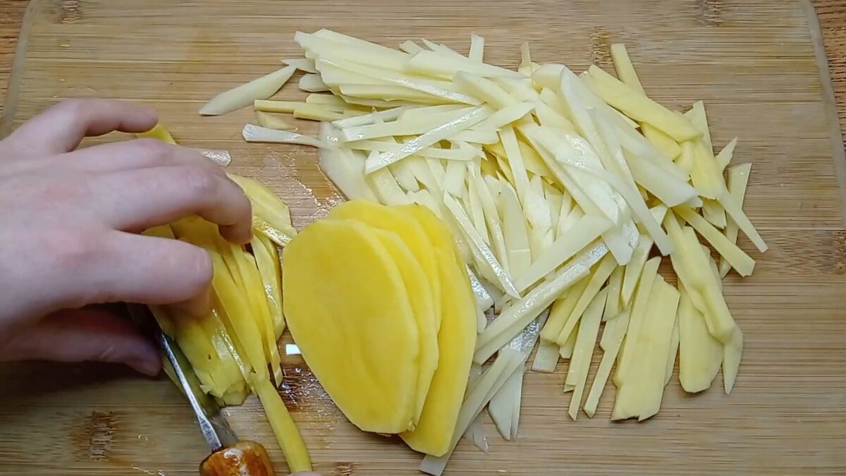 Пару картофелин нарезать тонкой соломкой и вымочить в воде, чтобы убрать крахмал.