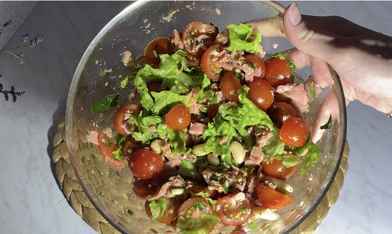Помидоры разрезаем на две части, тунец (если это филе) разминаем на кусочки, красный лук и чеснок мелко нарезаем. Для заправки использовать оливковое масло, дижонскую горчицу и лимонный сок. И, конечно же, сверху посыпаем любимой зеленью. Можно посыпать кунжутом.