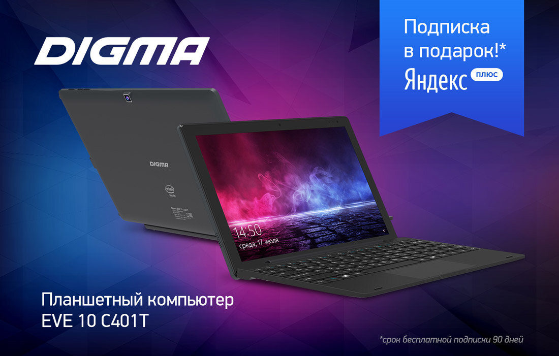 Ноутбук поставляются с бесплатным* промо от компании Яндекс. Это подписка Яндекс.Плюс, которая даёт возможность доступа к музыке, фильмам, кэшбэку баллами, и т.д. — всё в одном пакете, который вы получаете вместе с покупкой планшета, указанного в этом пресс-релизе. Смотрите кино и самые новые сериалы на КиноПоиск HD, слушайте музыку и подкасты на Музыке, получайте кешбэк баллами и тратьте их на такси, каршеринг, билеты в кино и многое, многое другое вместе с DIGMA!