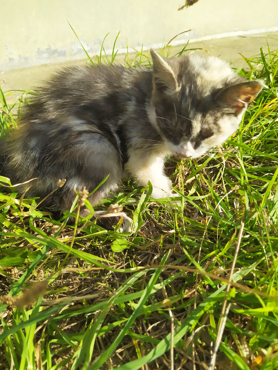 Утро одного из сентябрьских дней началось для меня со звонка мужа. Он просыпался и уходил на работу раньше меня, поэтому его звонок застал меня уже в полудрёме. "Саша, на дороге лежит котёнок", - начал он, и в моё воображение нарисовало самую жуткую картину (скорее всего, котёнок сбит и сильно травмирован или даже размазан по асфальту)... Муж продолжил: "Я отнёс его в траву под наши окна, покорми его, я опаздываю на работу". Как меня тогда обрадовало это " покорми": значит котёнок живой, и возможно наезд автомобиля - не более чем плод моего больного воображения. Я выглянула из окна: котёнок сидел в траве и не реагировал на моё "кис-кис". И я решила выйти к нему на улицу. Пока я оделась и собрала несколько вариантов угощения для малыша, он снова выполз на дорогу. Я вышла из подъезда, завернула за угол дома и увидела, что он сидит в центре проезжей части возле мусорных контейнеров, а с другой стороны на эту же дорогу выезжает машина, которая вывозит мусор. Я начала кричать "Кис-Ки