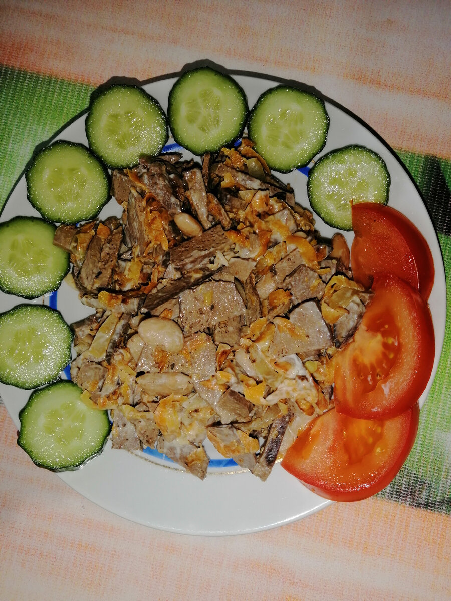Салат очень простой и сытный: Печень свиная отварная - 160гр.