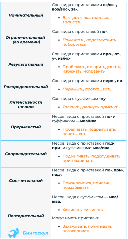 Глаголы, обозначающие начало действия и другие способы его совершения, имеют определенные словообразовательные модели, как видно из таблицы. Однако это не единственный способ выражения подобных значений.