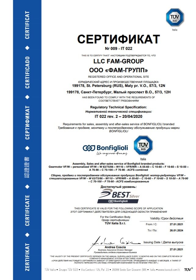 TÜV Italia, независимая компания по сертификации, одна из самых известных и признанных во всем мире, выдала ООО «ФАМ-Групп» сертификат менеджмента качества по продукции Bonfiglioli.
