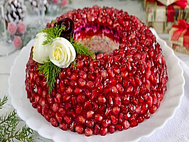 9. Украсьте верх салата семечками граната. Салат "Гранатовый браслет" с грибами и курицей готов к подаче к новогоднему столу.